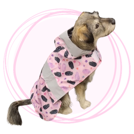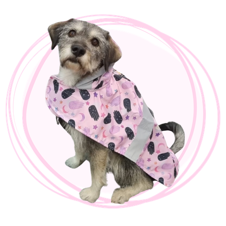 Dale a tu peludo protección y estilo con esta capa impermeable de diseño exclusivo con estampado de ojo turco rosado o azul . Su tela liviana y resistente al agua mantiene seco a tu perro o gato en los días lluviosos, mientras que sus bordes reflectivos aumentan la visibilidad y seguridad en paseos nocturnos o con poca luz.