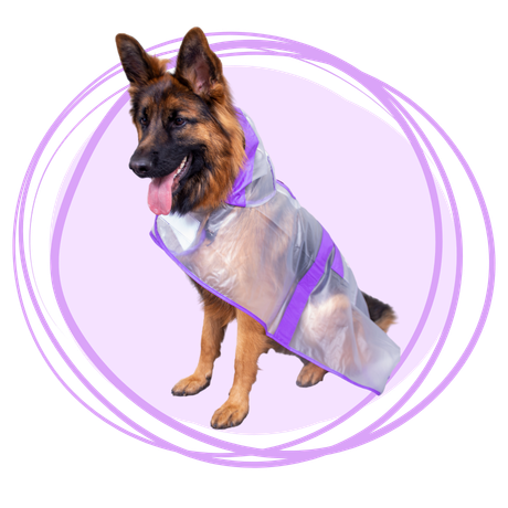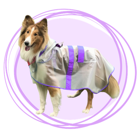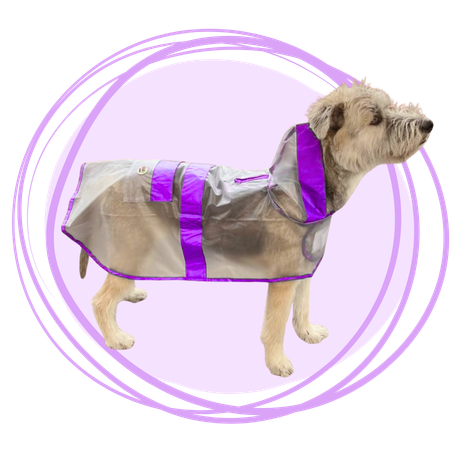 Protege a tu peludo de la lluvia sin esconder su pelaje con nuestra capa impermeable transparente con bordes morados . Su diseño liviano y funcional permite libertad de movimiento y una cobertura completa del cuerpo y cabeza. Ideal para perros de todas las razas.