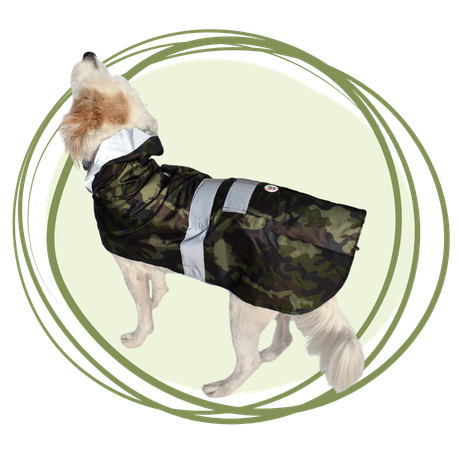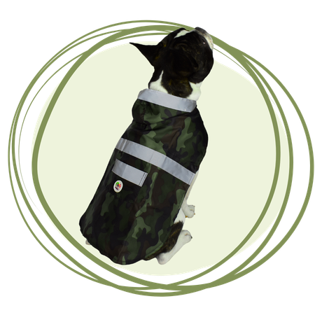 Dale a tu peludo protección y estilo con esta capa impermeable de diseño exclusivo con estampado militar. Su tela liviana y resistente al agua mantiene seco a tu perro o gato en los días lluviosos, mientras que sus bordes reflectivos aumentan la visibilidad y seguridad en paseos nocturnos o con poca luz.